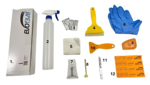 5. Microfiber cloth 6. Protective gloves 7. Mounting gel 8. Sponge brush 9. Rounded scraper 10. Spatula 11. Knife 12. Label for window lifters