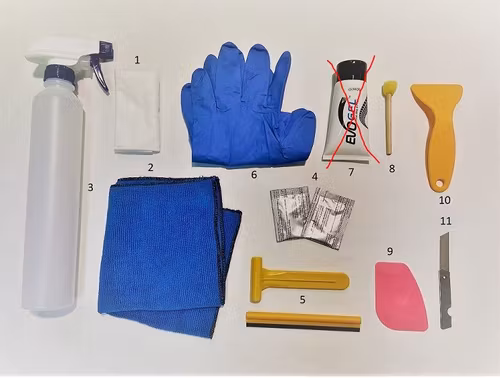 1. Cleaning cloth 2. Microfiber cloth 3. Spray bottle 0.5L 4. Assembly fluid 5. Scraper 6. Protective gloves 7. Assembly gel 8. Sponge brush 9. Rounded scraper 10. Spatula 11. Knife